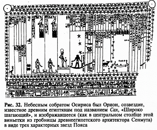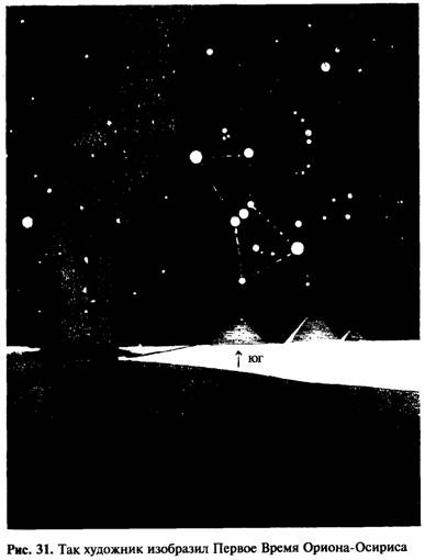 Небесным двойником Осириса является Орион – созвездие, известное у древних египтян под названием Сах, «Шагающий широко»; чаще всего, говоря о нем, имели в виду три характерные звезды, образующие «пояс». И поскольку, как утверждают, Осирис правил в Первом Времени, стоит подумать: не потому ли три великих пирамиды Гизы изображают звезды Пояса Ориона в том положении, которое они занимали 12 500 лет тому назад, в то астрономическое время, которое они называли Первым, то есть в начале восходящей части прецессионного цикла?