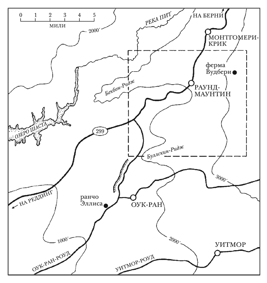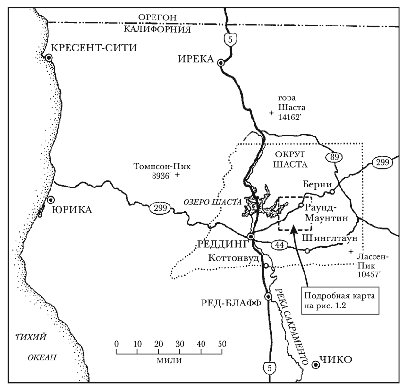 Журналисты из округа Шаста часто называют свой регион «Верхней Калифорнией», это горделивое наименование отличает и выделяет, в отличие от названия «Северная Калифорния», самые северные округа штата от области залива Сан-Франциско. Как показано на рис. 1.1, округ расположен на северной оконечности, тянущейся на 400 километров Калифорнийской Центральной долины, недалеко от границы с Орегоном. Река Сакраменто, орошающая северную половину Центральной долины, делит округ на две части. Реддинг, место пребывания властей округа и его крупнейший город, находится на высоте 500 футов, в том месте, где река Сакраменто спускается с гор к северу от долины, чтобы начать свое путешествие в 200 миль на юг, в сторону залива Сан-Франциско.