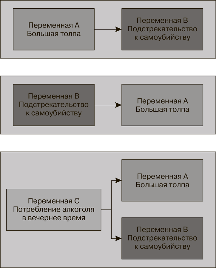 Рис. 1.2. Объяснение корреляций. Когда две переменные (такие как численность толпы и подстрекательство к самоубийству) коррелируют между собой, то возможно, что переменная А (в данном примере численность толпы) вызывает изменение переменной В (подстрекательство к самоубийству). Однако также возможно, что переменная В влияет на переменную А или что третья переменная С (в данном примере – потребление алкоголя в вечернее время) влияет на А и В независимым образом.