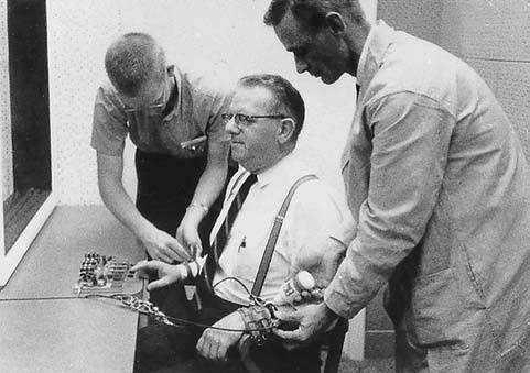 Эпизод эксперимента, спорного с этической точки зрения. В проведенном Милгрэмом исследовании повиновения власти его участников побуждали воздействовать электротоком на мужчину (показанного на фотографии), который утверждал, что у него проблемы с сердцем. Исследование вызвало немало вопросов по поводу создания для его участников сильного психологического дискомфорта.