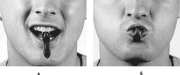 Попытайтесь сделать следующее: осторожно зажмите конец ручки зубами так, чтобы она не касалась ваших губ (см. рис. 2.4, а). Какое ощущение вы испытываете? Через какое-то время вытащите ручку изо рта, а потом снова зажмите ее конец одними губами (без помощи зубов) в горизонтальном положении и постарайтесь крепко держать ее так (см. рис. 2.4, б). Какое ощущение вы испытываете теперь? В 1988 г. Фриц Штрак, Леонард Мартин и Сабина Штеппер использовали это задание в эксперименте со студентами-добровольцами. Студентов (полагавших, что исследование посвящено изучению тех способов, которыми люди с физическими недостатками выполняют повседневные, необходимые им дела, например что-то пишут или набирают номер телефона) просили держать ручку зубами, губами или в недоминантной руке. Держа ручку одним из таких способов, они соединяли линиями точки на бумаге или подчеркивали написанные слова. Затем студентов просили оценить, насколько смешными были показанные им комиксы, предлагая обвести кружком соответствующее число на шкале оценок, держа при этом ручку одним из трех заданных способов. Исследователи рассчитывали увидеть различия в оценках комиксов у студентов, державших ручку тремя разными способами. Что, по вашему мнению, они обнаружили? Почему?