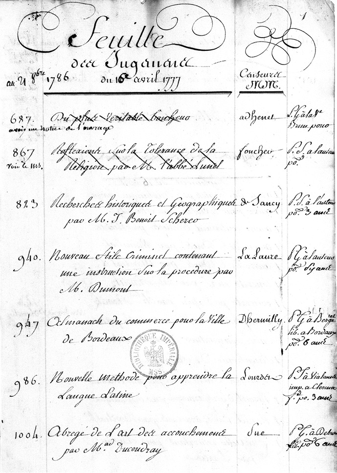 Рис. 4. Страница из ведомости суждений, feuille des jugements, показывающая число цензурных писем, billets de censure, с суждениями, jugements, названия книг, имена цензоров и решения, касающиеся типа разрешения (привилегия, permission tacite или permission simple), и срок его действия