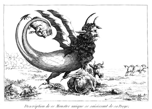 Изображение сего диковинного монстра в момент, когда он настигает добычу. Сей монстр был обнаружен в королевстве Санта-Фе, что в Перу, близ озера Фагуа в провинции Чили во владениях Проспера Востона. Он появлялся ночью и пожирал свиней, коров и быков по всей округе. Тело его – одиннадцати футов длиной; морда походит на грубое подобие человеческого лица; пасть – шириною во всю морду и снабжена рядом двухдюймовых зубов; голову венчают рога длиной в двадцать четыре фута наподобие бычьих; уши похожи на ослиные и имеют четыре дюйма в длину; у него два крыла, своею формою сходных с крыльями летучей мыши; бедра и лапы – двадцати пяти, а когти – восьми дюймов в длину; у него два хвоста: один необычайно гибок и способен изгибаться кольцами для удержания добычи, а второй, с жалом на конце, приспособлен для ее убийства; тело его сплошь покрыто чешуей. Монстр сей был пойман стараниями множества людей, приуготовивших ловушки, в которые оный и угодил. Опутанного сетями, его живьем доставили вице-королю, который соизволил позаботиться о его ежедневном прокорме, состоящем из теленка, коровы или быка, а также трех-четырех свиней, к коим сие существо имеет особливое пристрастие. Поскольку отправка монстра морем через мыс Горн заняла бы, по меньшей мере, пять или шесть месяцев, а также потребовала бы погрузки на суда чрезмерного количества скота для его прокорма, вице-король разослал распоряжения об обеспечении потребностей означенного диковинного существа вдоль путей сухопутных, по которым его будут перевозить этапами до Гондурасского залива, где погрузят на корабль, следующий в Гавану. Оттуда монстра доставят на Бермуды, затем на Азорские острова, после чего в трехнедельный срок привезут и выгрузят в Кадисе. Из Кадиса короткими переходами монстра отправят на обозрение королевскому семейству. Следует надеяться, что удастся поймать также и женскую особь во избежание вымирания сего монстра в Европе. Похоже, что сей вид родствен гарпиям, которые считались доселе существами мифическими.