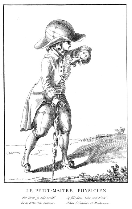 Сатирическое изображение модного, франтоватого ученого-самоучки. Этот «физик» собирается улететь от кредиторов и любовниц, прямо в своем напоминающем воздушный шар костюме.