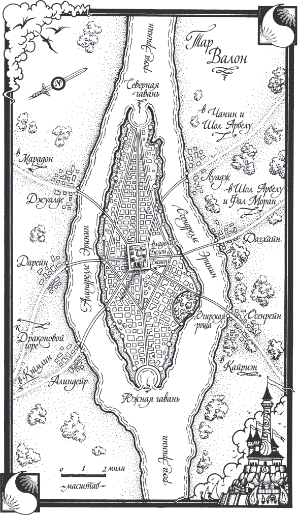 Мост был всего лишь началом. Дальний конец его арки подходил к стенам, что окружали остров; те были из ослепительно сияющего белого камня с серебристыми прожилками, и своей верхней кромкой стены с превосходством взирали на изгиб моста. Гладь стен через равные промежутки прерывали сторожевые башни из такого же белого камня, и река омывала их массивные подножия. Но за стенами и выше их возносились истинные башни Тар Валона, башни из преданий, их остроконечные шпили, желобчатые колонны и закручивающиеся спиралями переходы, соединенные тут и там воздушными мостами в доброй сотне, а то и более шагов над землей. Но и это всего лишь было начало.