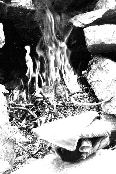 Можно гадать на оленьей лопатке и по-другому. Так же, как и в первом случае, лопатка тщательно очищается от мяса. Затем к ее середине подносят горящий или тлеющий уголек. На уголек нужно дуть или обмахивать опахалом до тех пор, пока кость не обуглится и не даст первую трещину. По окончании гадания прожженное место кости сразу же выламывают и разбивают на мелкие кусочки. Причем для гадания на себя или близкого по крови используется левая лопатка оленя. Для тех, кто не является родственником, используют правую лопатку оленя (ее еще называют «чужой»).