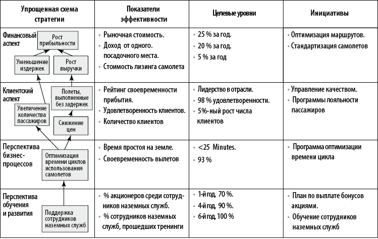 Уравновешивая стратегические и финансовые цели, методология сбалансированных показателей позволяет ставить практические цели, которые связывают стратегию бизнеса с созданием стоимости как для акционеров, так и для других стейкхолдеров. На рис. 2.4 показана система сбалансированных показателей для одной из региональных авиакомпаний США.