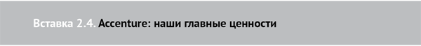 Осознание предназначения – четко сформулированного в миссии и ви́дении – зачастую дополняется убеждениями (даже «верованиями»), как эта цель должна быть достигнута. Такие существующие в компании убеждения заключаются в совокупностях ценностей и этических принципах – приверженности некоторым морально-этическим стандартам. Ценности компании могут быть сформулированы как набор принципов, которыми следует руководствоваться членам организации при принятии решений и совершении действий. Во вставке 2.4 обобщены ценности и принципы бизнеса крупнейшей мировой консалтинговой компании Accenture plc.