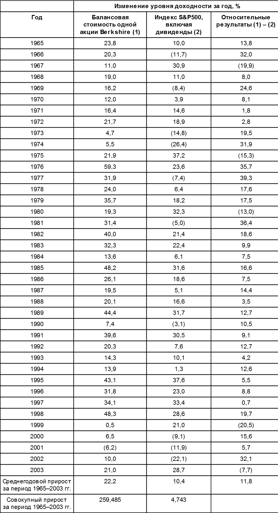 Когда Уоррен Баффет взял на себя управление Berkshire Hathaway, собственный капитал компании составлял 22 млн долл. Сорок лет спустя эта сумма выросла до 69 млрд долл. На протяжении длительного периода времени целью Баффета было увеличение балансовой стоимости акций Berkshire Hathaway на 15 % ежегодно, что существенно превышало показатели среднестатистической американской компании. После того как Баффет начал руководить Berkshire в 1964 году, фактические темпы роста компании превышали запланированные: балансовая стоимость акции компании увеличилась с 19 до 50 498 долл., что соответствовало росту стоимости акций в среднем на 22,2 % в год. Такая относительная эффективность производит еще большее впечатление, если принять во внимание невыгодное положение компании Berkshire Hathaway: ей приходится платить как подоходный налог, так и налог на прирост рыночной стоимости капитала (при этом следует отметить, что доходность индекса Standard & Poor’s 500 определяется до вычета налогов).