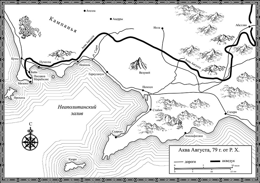 Аттилий, сощурившись, вглядывался в темноту. О, Августа была настоящим чудом – одним из величайших произведений инженерного искусства, когда-либо существовавших в мире. Надзирать за ней – большая честь. Вдали от Мизен, на противоположной стороне залива, высоко в Апеннинских горах, поросших сосновым лесом, этот акведук вбирал в себя истоки Сериния и нес воды на запад – проводя их через трубы по извилистым подземным путям, через ущелья по ступенчатым аркадам, прогоняя через долины сквозь огромные сифоны – и так до самых равнин Кампаньи и дальше, вокруг Везувия, на юг, к берегу Неаполитанского залива, и, наконец, через весь Мизенский полуостров к этому пыльному портовому городу. Августа тянулась почти на шестьдесят миль, а значит, понижалась на ширину ладони за каждые триста футов. Это был самый длинный акведук в мире – даже длиннее, чем великие акведуки Рима, – и куда более сложный, чем его северные собратья, питавшие водой лишь один-единственный город. Извилистый трубопровод Августы – материнская жила, как его именовали, – поил ни много ни мало девять городов, лежащих на берегах Неаполитанского залива: Помпеи, расположенные в самом конце длинного ответвления, затем Геркуланум, Нола, Ацерра, Ателла, Неаполь, Путеолы, Кумы, Байи и, наконец, Мизенум.