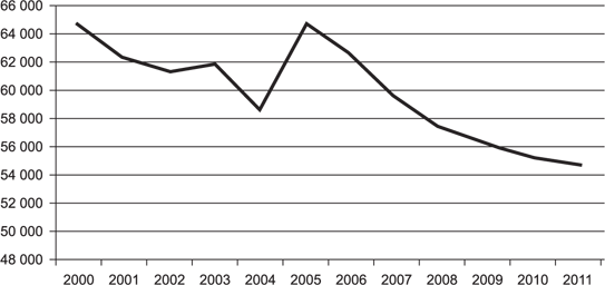 Среднегодовой доход молодых выпускников колледжей продолжает падать* (в пересчете на неизменные доллары США по состоянию на 2011 год)