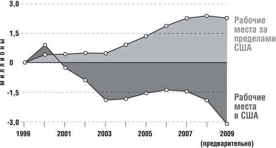 Куда уходят рабочие местаПосле 2000 года американские многонациональные компании увеличили количество рабочих мест за рубежом и сократили его в США. Совокупные изменения с 1999 года