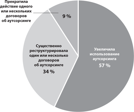 Согласно результатам исследования, главной целью аутсорсинга было сокращение издержек производства. Лишь относительно малый процент респондентов (чуть больше 10 процентов) сказали, что целью аутсорсинга было получение доступа к возможностям мирового уровня. Это означает, что компании занимались аутсорсингом, чтобы экономить деньги, а не для того, чтобы производить продукты лучшего качества.