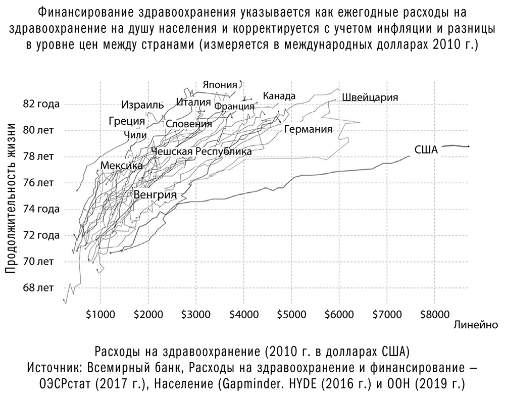 Рисунок 1–1: Сравнение расходов на здравоохранение и ожидаемой продолжительности жизни в странах Организации экономического сотрудничества и развития (ОЭСР) за 45 лет, 1970–2015 гг. США тратят больше всех, но получают меньше всех.