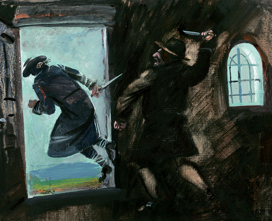 Мне было не по себе, когда он заставил меня спрятаться вместе с ним за открытой дверью. К тому же гость и сам изрядно трусил – я видел, как он ухватился за кортик и чуть выдвинул его из ножен.