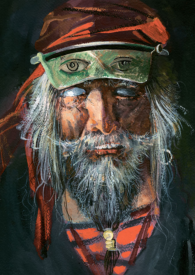 Вдруг я увидел, как по дороге, ощупывая её палкой, идёт сгорбленный старик в драном матросском плаще с капюшоном. Над глазами у него торчал зелёный козырёк. По-видимому, он был слеп. Дойдя до трактира, старик остановился и, неизвестно к кому обращаясь, гнусавым голосом проблеял нараспев:
