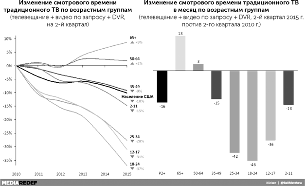 Телевизионная реклама повторяет печальную участь газетной рекламы, так как уменьшение зрительской аудитории не могло ускользнуть от внимания маркетологов{23}. Сокращение рекламных расходов, с которым в 2007 г. столкнулись печатные СМИ, к 2015 г. начало ощущаться и в телевизионной сфере{24}.