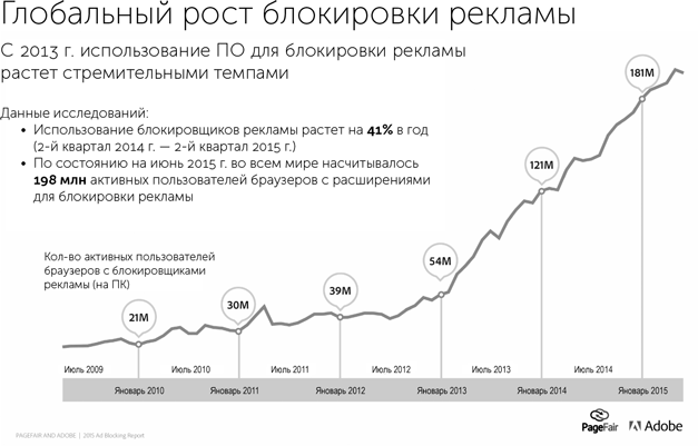 Затем появилась еще более скверная новость для маркетинга. В сентябре 2015 г. PageFair и Adobe сообщили, что на данный момент 198 млн пользователей во всем мире используют на своих ПК браузеры с блокировщиками рекламы и их число растет на 41 % в год. Через месяц Apple представила обновление для операционной системы iOS, позволяющее мобильным устройствам Apple поддерживать блокировку рекламы. Предположительно в одном только 2016 г. во всем мире пользователи заблокировали рекламу общей стоимостью около $41,4 млрд. Потребители открыли новый фронт в своем восстании против рекламных вторжений и манипуляций эмоциями.