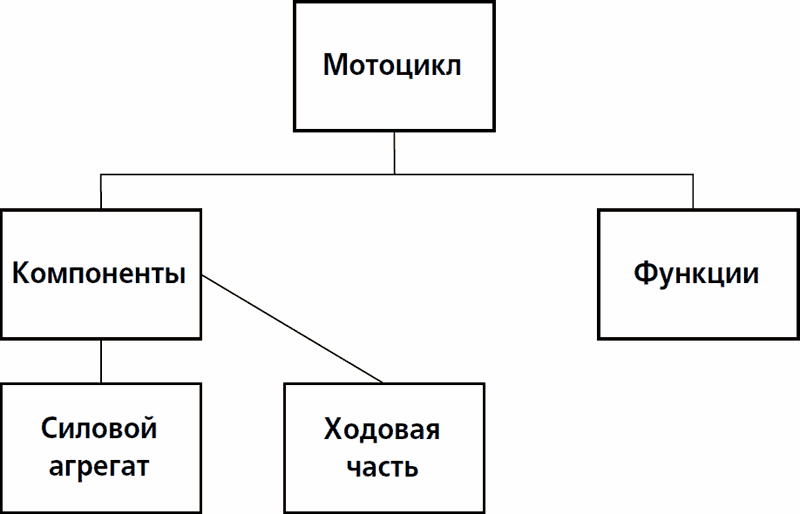 Квадратик «мотоцикл» содержит квадратики «компоненты» и «функции». «Компоненты» содержат «силовой агрегат» и «ходовую часть» – и так далее. Есть много других структур, произведенных другими операторами, например «служить причиной». Здесь образуется длинная цепь: «А служит причиной Б, которое служит причиной В» – и так далее. Эта структура берется для функционального описания мотоцикла. «Существует», «равняется» и «подразумевает» деятеля дают уже другие структуры. Они обычно взаимосвязаны такими сложными и разветвленными узорами и тропами, что никому не под силу за всю жизнь понять их целиком – разве что часть. Общее название для этих взаимодействующих структур, род, в котором иерархия содержания и структура причинности всего лишь виды, – система. Мотоцикл – система. Настоящая система.