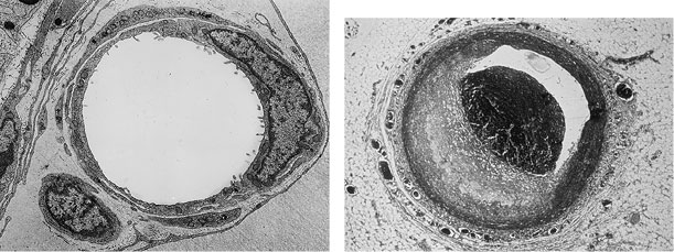 Рис. 8. Здоровый кровеносный сосуд (слева) и кровеносный сосуд с атеросклеротическими бляшками (справа)