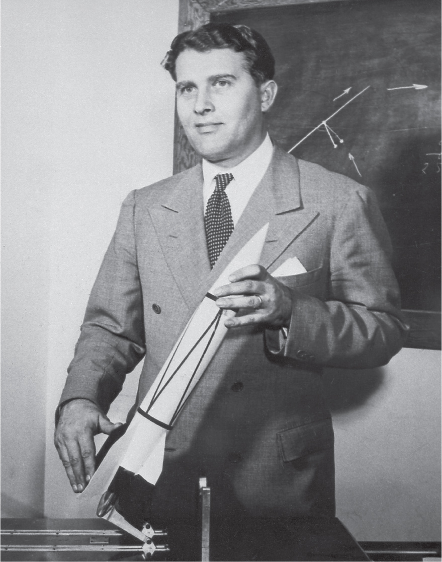 Wernher von Braun photographed in the early 1950s holding a model of the V-2 rocket.