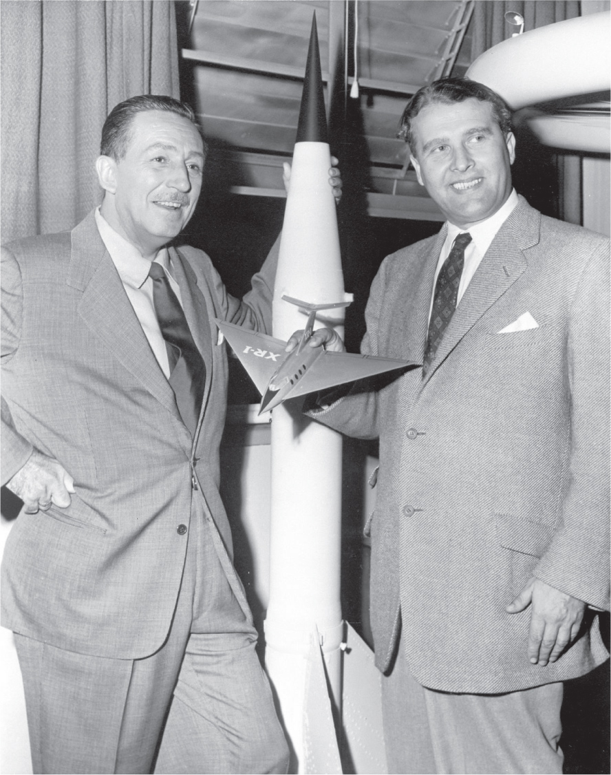 Even while overseeing the development of the Redstone rocket and working on a top-secret plan to quickly and inexpensively launch the first satellite into orbit, code-named Project Orbiter, von Braun continued his public advocacy for human spaceflight. An unexpected opportunity arose directly as a result of the Collier’s publications, just as the magazine released its eighth and final space-themed issue, featuring a description of the first human voyage to Mars. In early 1954, Hollywood came calling, in the person of Walt Disney, who was interested in producing a series of well-financed hour-long documentary films based on the magazine series. Disney was in the midst of creating a new prime-time TV program, Disneyland, which would mix recycled older content and new programming in order to promote another new venture, his California theme park, scheduled to open in 1955.