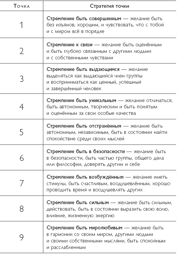 Каждая из девяти точек Эннеаграммы представляет собой стратегию взаимодействия с окружающей средой, которая влияет на личность (см. таблицу 1, где вы найдёте определение стратегий). Вы имеете доступ к каждой из этих стратегий и, в идеале, можете выбрать любую, которая подходит к данной конкретной ситуации. Однако если вы зациклены на вашем привычном личностном паттерне, вы обычно полагаетесь на вашу любимую стратегию (мы называем её Предпочитаемой стратегией) независимо от ситуации, считая, что эта стратегия является решением всех ваших сложных ситуаций и проблем. Цель использования Эннеаграммы – помочь вам увидеть ограничения, возникающие, если чрезмерно полагаться на эти привычные паттерны, и помочь вам расширить свой поведенческий репертуар, включить в него более гибкие – и более эффективные – действия.