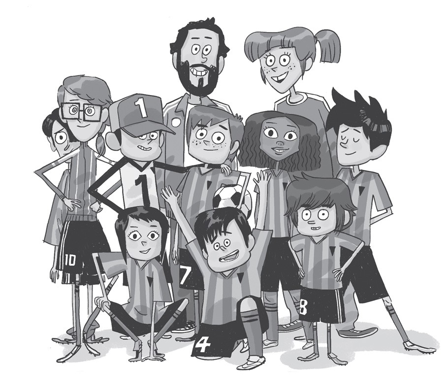 И наконец, номер 10, Анита, вратарь запаса, которая никогда раньше не была вратарём, а просто убедила маму забрать её из балета и записать в футбол, который ей больше нравится. Анита носит очки и совсем не видит мяча, даже когда он летит прямо в неё. Но так как она запасная, до нынешнего дня это нас не беспокоило.