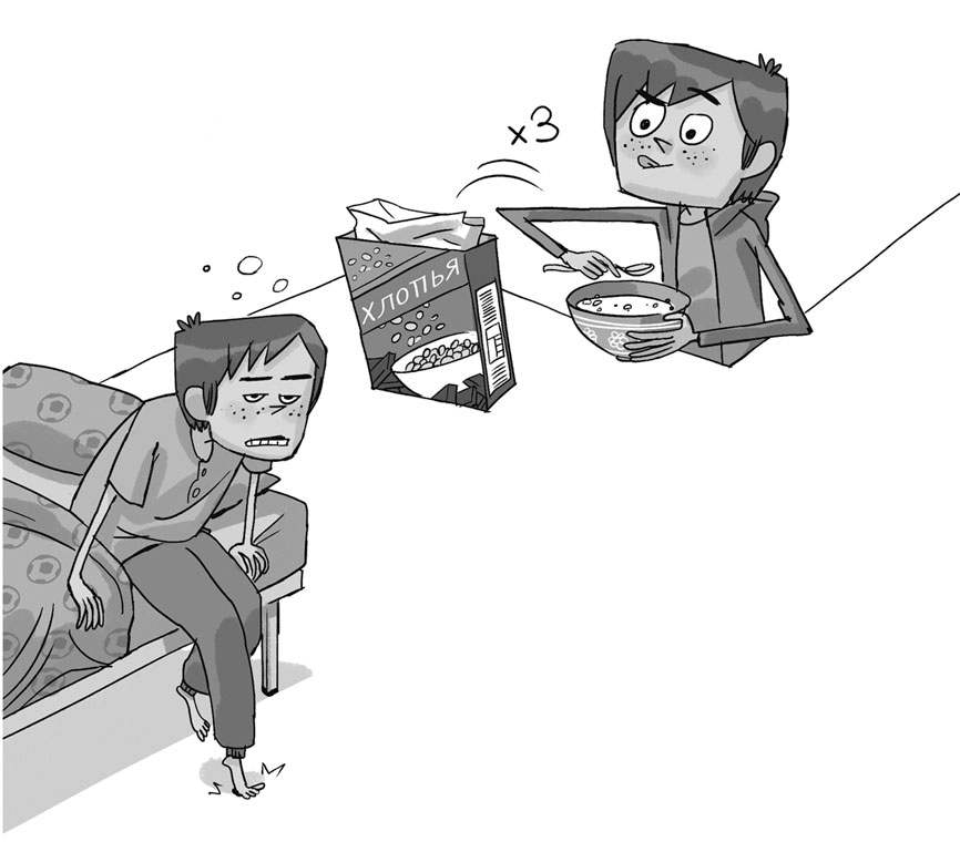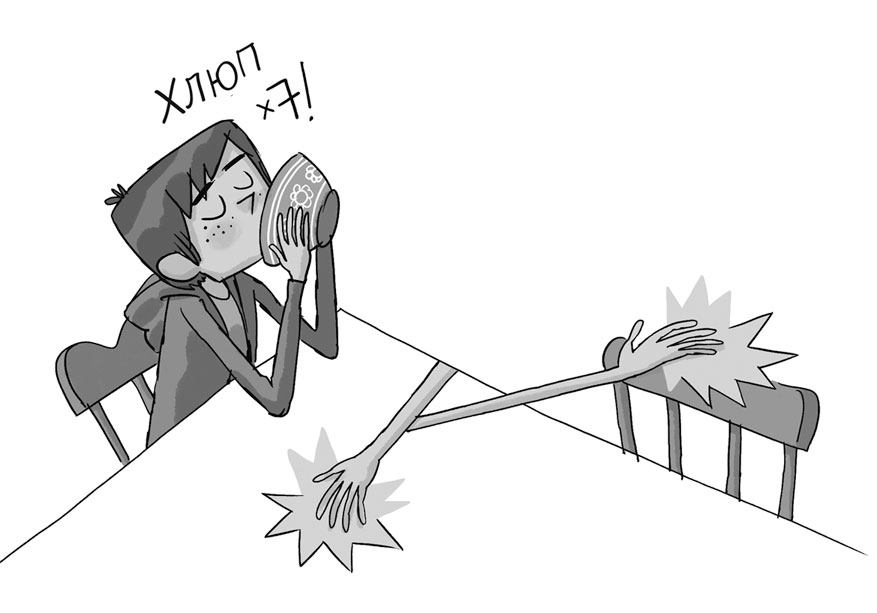 Потом я кладу ровно три ложки хлопьев в миску с молоком. Выпиваю молоко от хлопьев ровно за семь глотков.