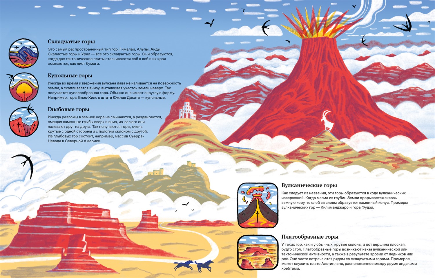 Есть пять типов гор, которые формируются и выглядят по-разному.