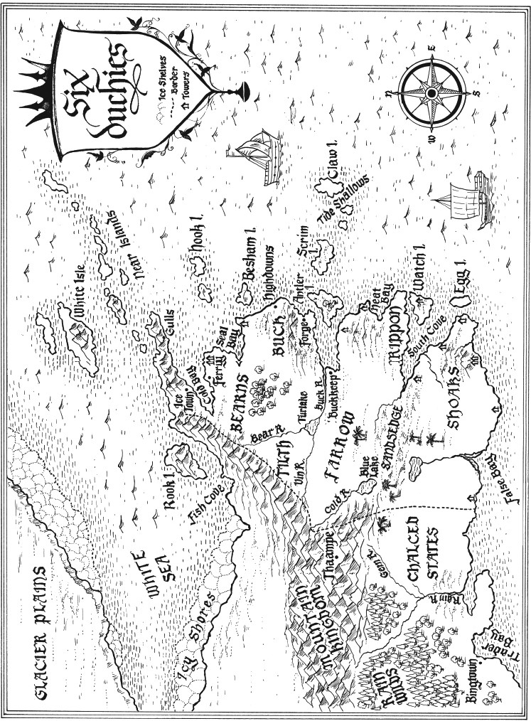 Spring had come to Buckkeep Castle. The grim black stone edifice still crouched suspiciously on the steep cliffs above Buckkeep Town, but on the rolling hills behind the keep, new green grass was pushing optimistically up through the standing brown straw of last year’s growth. The bare-limbed forests were hazed with tiny green leaves unfurling on every tree branch. The wintry mounds of dead kelp on the black beaches at the foot of the cliffs had been swept away by the tides. Migratory birds had returned, and their songs rang challenges in the forested hills and along the beaches where sea birds battled for choice nesting nooks in the cliffs. Spring had even invaded the dim halls and high-ceilinged chambers of the keep, for blossoming branches and early blooming flowers graced every alcove and framed the entries of the gathering rooms.