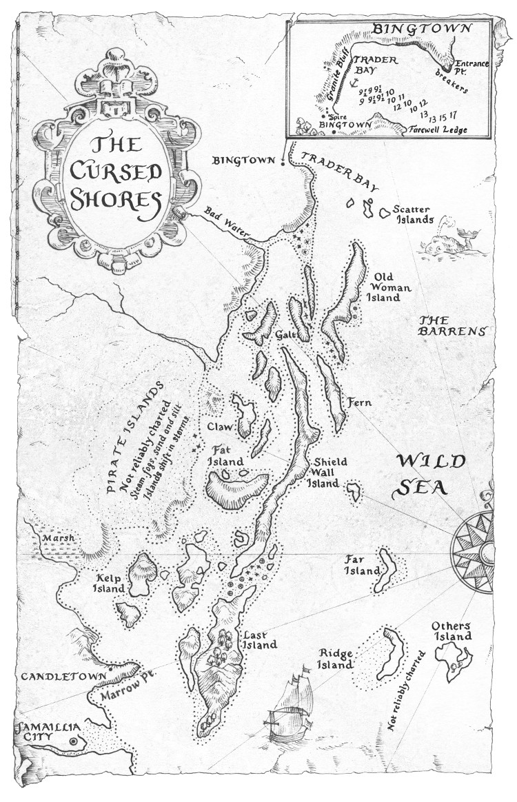 On the other side of Others’ Island, his two-masted ship was anchored in Deception Cove. He had brought the Marietta in to anchor there as the morning winds had blown the last of the storm clean of the sky. The tide had still been rising then, the fanged rocks of the notorious cove grudgingly receding beneath frothy green lace. The ship’s gig had scraped over and between the barnacled rocks to put him and Gankis ashore on a tiny crescent of black sand beach which disappeared completely when storm winds drove the waves up past the high tide marks. Above, slate cliffs loomed and evergreens so dark they were nearly black leaned precariously out in defiance of the prevailing winds. Even to Kennit’s iron nerves, it was like stepping into some creature’s half-open mouth.