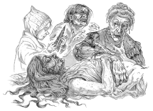 The woman in the grubby nightgown peeped out at her elder sister through a chink between her fingers. Then she blew her nose upon its large collar and shuffled reluctantly closer to the stretcher.