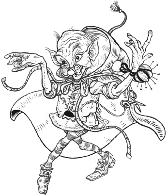 On to the path leaped a strange little creature. It was a long-legged goblin, wearing striped woollen stockings under a soft leather tunic, over which was a waistcoat of orange velvet. A hooded cape was fastened under his chin and a pair of pince-nez was balanced on his sharp nose.