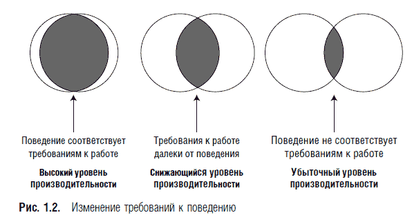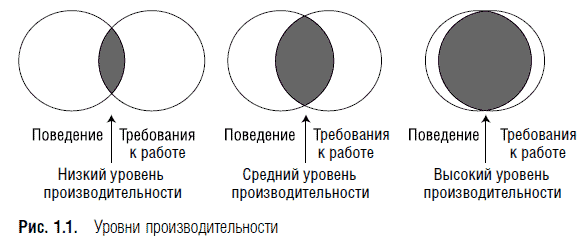Эффективность работы каждого на рабочем месте, т. е. достижение высокой производительности, зависит от степени соответствия поведения моделям, необходимым для выполнения данной работы. Это проиллюстрировано на рис. 1.1. Чем больше зоны совпадения двух кругов, тем выше уровень производительности.