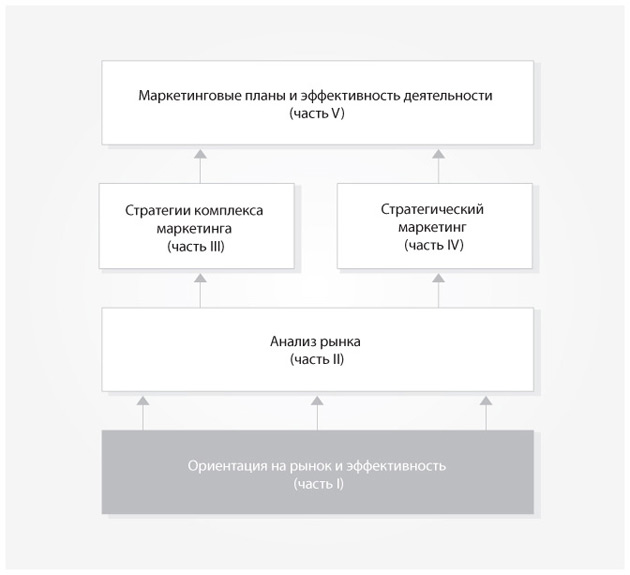 В данной модели представлены как логика управления на основе рыночных требований, так и структура книги. Ориентация на рынок и эффективность маркетинга (часть I) – основа анализа рынка (часть II) с учетом оценки потребностей клиентов, тенденций развития рынка и конкуренции. Приверженность рыночной направленности и непрерывный его анализ позволяют разработать сфокусированные стратегии комплекса маркетинга (часть III) и стратегического маркетинга (часть IV). Кульминация работы – маркетинговые планы и эффективность деятельности (часть V).