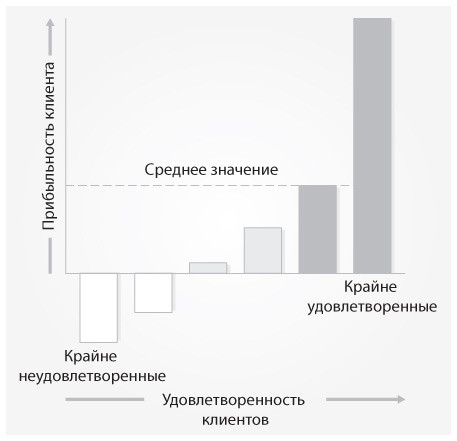 Серьезная сфокусированность на клиентах и их удовлетворенности позволяет добиться высокого уровня лояльности. Сохранение хороших клиентов – приоритет для менеджеров, ориентированных на рынок. Клиентоориентированная компания имеет гораздо больше шансов на развитие и внедрение стратегий, обеспечивающих высокие уровни удовлетворенности и лояльности потребителей. А удовлетворенность – ключ к прибыльности клиента. Чуть ниже мы увидим, что именно полностью удовлетворенные, лояльные клиенты обеспечивают прибыльность.