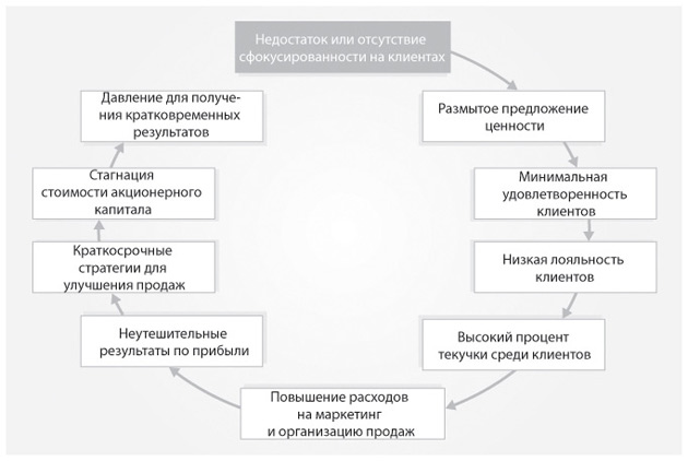 Если взглянуть на рис. 1.1 и двигаться по часовой стрелке сверху вниз, можно заметить, что слабая сфокусированность или ее отсутствие приводят к размытому предложению и минимальной удовлетворенности клиентов. В результате снижается лояльность потребителей: они становятся легкой добычей для конкурентов. Маркетинговые мероприятия, направленные на предотвращение такой ситуации, недешевы. Дорого обходится и привлечение новых клиентов взамен потерянных3. Низкий уровень лояльности и более высокие расходы на маркетинг приводят к неутешительным итогам с точки зрения прибыльности. Чтобы быстро улучшить финансовые результаты, компании прибегают к тактике лихорадочных продаж и различным бухгалтерским маневрам. Но инвесторы и аналитики с Уолл-стрит могут копнуть глубже, и стоимость акций организации перестанет расти. Ситуация осложняется, когда на руководство давит необходимость роста прибыльности в краткосрочной перспективе. У него не остается ни времени, ни стремления понять потребности клиентов или поразмыслить над сутью стратегий конкурентов. В результате намного сложнее разорвать порочный круг низкоэффективной деятельности.