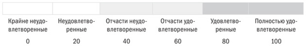Оценить удовлетворенность клиентов можно разными способами. Наиболее распространенный – индекс потребительской удовлетворенности (ИПУ (CSI – customer satisfaction index.)). Он рассчитывается на основе оценок общей удовлетворенности по 6-разрядной шкале, начиная с крайне недовольных и заканчивая полностью довольными клиентами. Как можно заметить, каждому уровню потребительской удовлетворенности присваивается рейтинг от 0 (для крайне неудовлетворенных) до 100 (для полностью удовлетворенных).