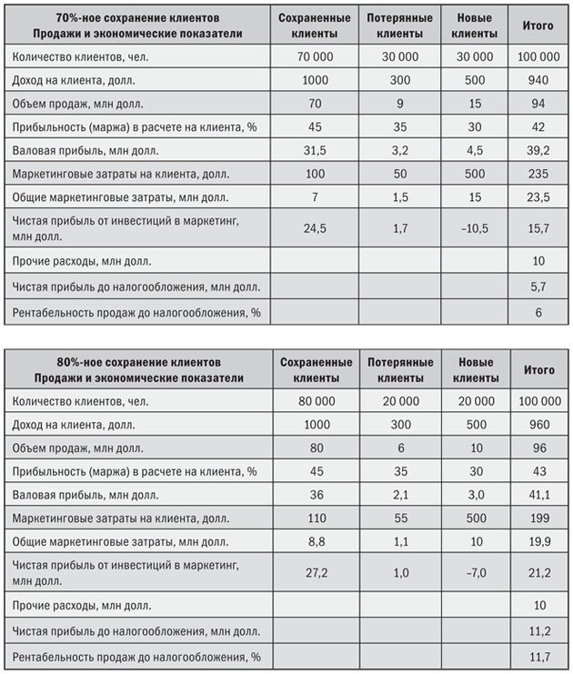 Основную прибыль компании приносят сохраненные клиенты. Если доля удержания потребителей в компании (70 %) не изменится, то клиенты обеспечат ей 74,4 % выручки от продаж и 80 % от валовой прибыли. Чистая прибыль от маркетинга (валовая прибыль за вычетом расходов на маркетинг и продажи) составит 24,5 млн долл., а потерянные клиенты приносили чистую прибыль от маркетинга на уровне 1,7 млн долл. Поскольку затраты на приобретение новых потребителей высоки и они обычно покупают меньше, чистая прибыль от работы с ними равна –10,5 млн долл. Если учесть постоянные расходы в размере 10 млн долл., то 70 %-ный уровень удержания клиентов позволит получить прибыль до налогообложения на уровне 5,7 млн долл. с рентабельностью продаж до налогообложения на уровне 6 %.