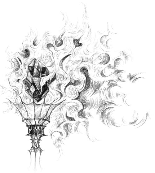 Адское Пламя было изящной урной, мастерски сработанной из языков серебристого огня; в кончиках пылающих пальцев покоился рубин размером с кулак. Пальцы сжимали его так сильно, что разомкнуть их не представлялось возможным, но вопреки их хватке самоцвет источал холодное сияние.
