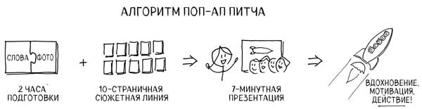 Алгоритм поп-ап питча: два часа подготовки к десятистраничному рассказу приносят семиминутную презентацию, которая вдохновляет, мотивирует и побуждает предпринять какие-то действия