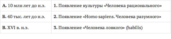 12. Укажите соответствие дат левого столбика изменениям в первобытном человеке и его культуре, обозначенным в правом столбике: