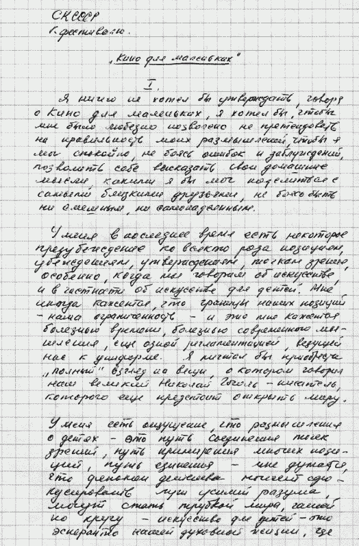 С детским кино и телевидением – худо. Лучше, конечно, чем во многих странах, но тем не менее положение не привилегированное, а наоборот, ущемленное по сравнению с другими жанрами: невнимание к деятелям детского кино и телевидения, недоверие к их творческим силам (см. доклад на съезде учителей, преподавание на режиссерских курсах детского кино); закрытие «Юности» – и это при том, что Студия им. Горького[29] – очень слабая студия, а детский фестиваль – ерундовый фестиваль, фестиваль-спутник.