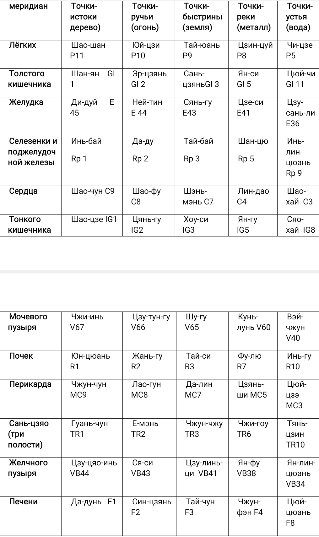 Точки- реки– когда есть одышка, кашель, озноб, лихорадка, когда болезни проявляются в нарушении голоса; болезни желудка, кишечника и других фу-органов (полых), при неправильном питании, извращение ци, поносе, находятся у локтевых и коленных суставов.