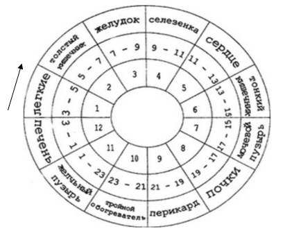 Энергия движется по меридианам и имеет фазы максимальной и минимальной активности. Начиная свое движение с меридиана Лёгких, энергия максимальна активна в этом меридиане с 3.00 ч. до 5.00 ч (минимальная активность в данном меридиане с 15.00-до 17.00 ч.), далее переходит в меридиан Толстого кишечника и продолжая движение завершает цикл в меридиане Печени, фаза максимальной активности в котором с 01.00 ч. до 03.00 ч., снова переходя в меридиан Легких. Если вы не можете заснуть с 23.00 ч., то опираясь на данную схему, можно понимать, что нужно обратить внимание на желчный пузырь, так как в указанное время энергия максимально активна в меридиане Желчного пузыря, если вы просыпаетесь среди ночи, примерно в 2.00 ч., то в это время максимально активен меридиан печени.