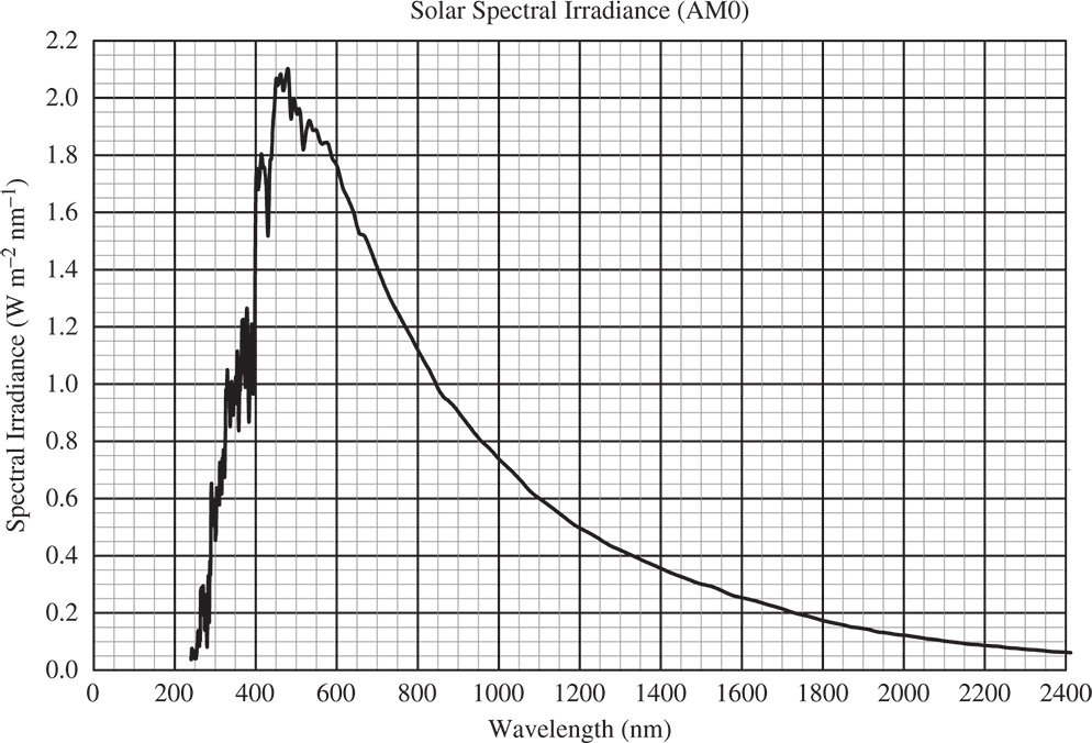Similarly, the solar flux arriving at the earth's surface may be denominated in terms of the spectral irradiance – that is the solar flux per unit area of the earth's surface per unit bandwidth. In the case of Figure 7.5, the data presented represents the spectral irradiance of the sun above the earth's atmosphere, as signified by the parameter ‘AM0’ or air mass zero.