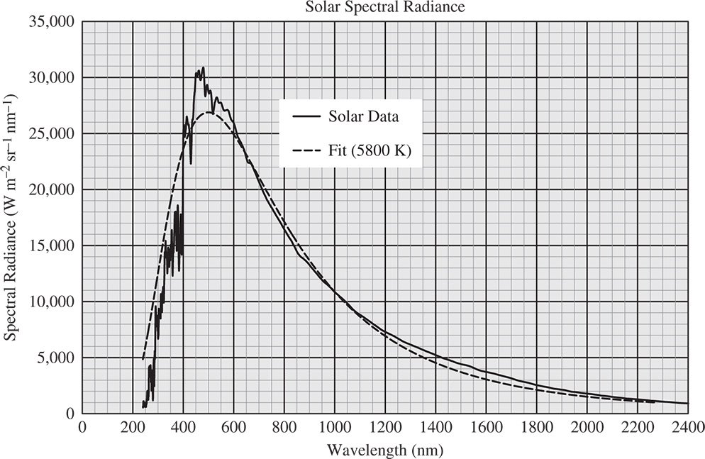 Figure 7.6 Solar spectral radiance and 5800 K blackbody radiance.