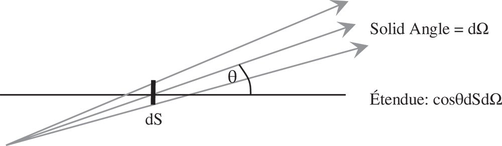 G is the étendue and θ is the tilt of the surface normal with respect to the ray pencil.