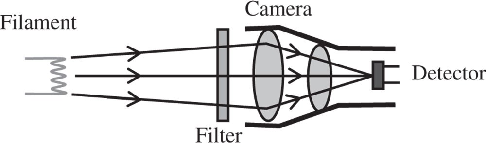 We are told that the source is a 3000 K blackbody emitter; therefore we should be able to calculate the spectral radiance from Eq. (7.9). In fact, we are interested in the spectral radiance at 500 nm. From Eq. (7.9), the spectral radiance is 2.6 × 1011 W m−3 sr−1 or 260 W m−2 sr−1 nm−1 at 500 nm. The radiance transmitted by the 5 nm bandwidth filter is 5 × 260 or 1300 W m−2 sr−1 at. We now need to calculate the system étendue from Eq. (7.9). The numerical aperture of the system in image space is 0.25 (for f#2) and the area, S, of a single pixel is 10−5 × 10−5 = 10−10 m2.